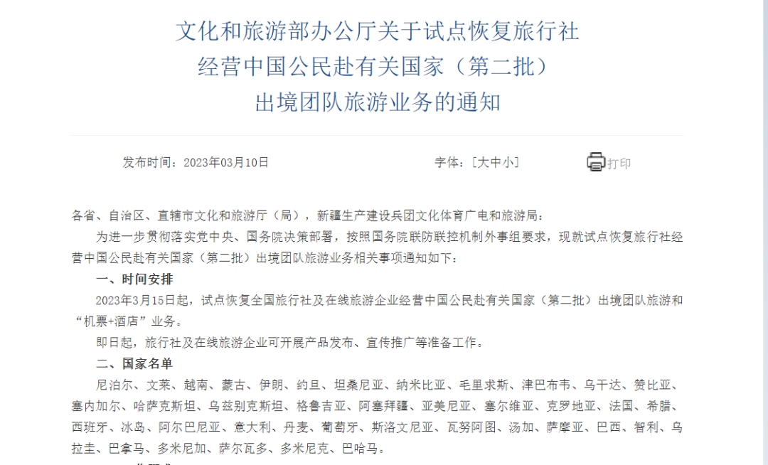 3月10日,文化和旅游部公布第二批恢復(fù)出境團(tuán)隊(duì)旅游國(guó)家名單,共計(jì)40個(gè)國(guó)家。通知顯示,自2023年3月15日起,試點(diǎn)恢復(fù)全國(guó)旅行社及在線旅游企業(yè)經(jīng)營(yíng)中國(guó)公民赴有關(guān)國(guó)家(第二批)出境團(tuán)隊(duì)旅游和“機(jī)票+酒店”業(yè)務(wù)。即日起,旅行社及在線旅游企業(yè)可開(kāi)展產(chǎn)品發(fā)布、宣傳推廣等準(zhǔn)備工作。