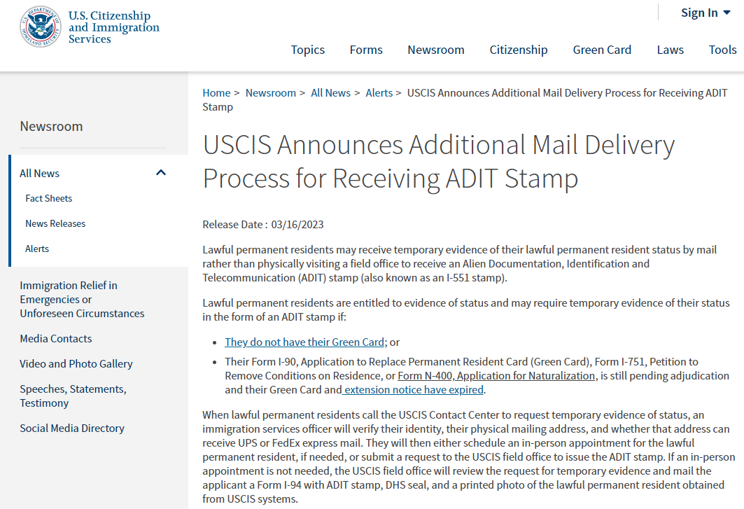 移民局可以用蓋ADIT印章的形式簽發臨時身份證明。ADIT印章原則上有效期不超過一年,但美國移民局會確定申請人是否可以收到ADIT印章,并根據申請人的具體情況自行決定有效期。
