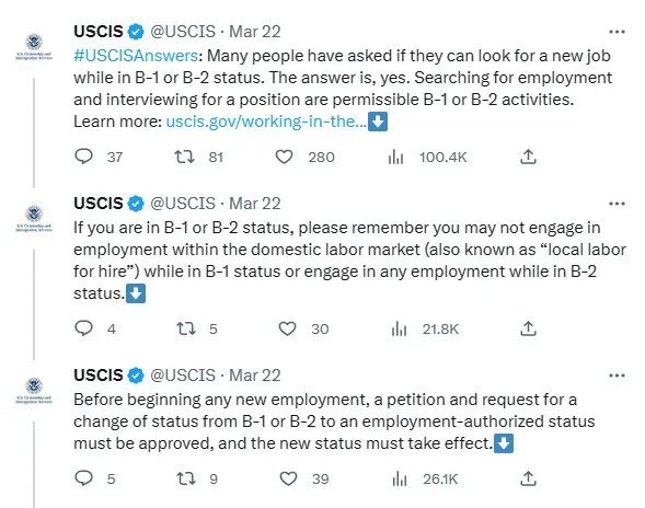 美國移民局在推特中表示:“許多人問他們是否可以在B-1或B-2身份下尋找新工作。答案是肯定的。求職和面試職位是允許使用B-1簽證的。”
