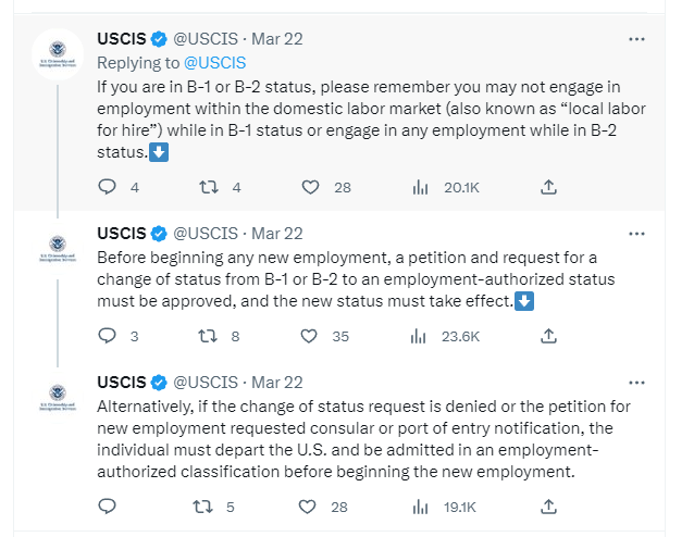 眾所周知,商務/旅游簽證(B-1/B-2 Visa)是不能在美國工作的。不過,3月22日,美國移民局(USCIS)在官方推特上正式說明:旅游簽證可以在美國找工作!引起了網上極大的關注。