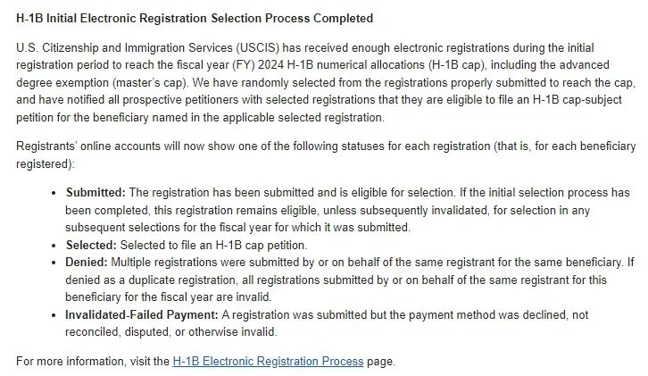 截止到目前為止,移民局雖然還未官宣今年一共收到多少份電子注冊、中簽情況如何,但移民局宣布:他們今年收到的H-1B注冊數(shù)量已達(dá)到抽簽類H-1B的年度上限,他們已經(jīng)完成了抽簽且已經(jīng)更新完了所有中簽情況!