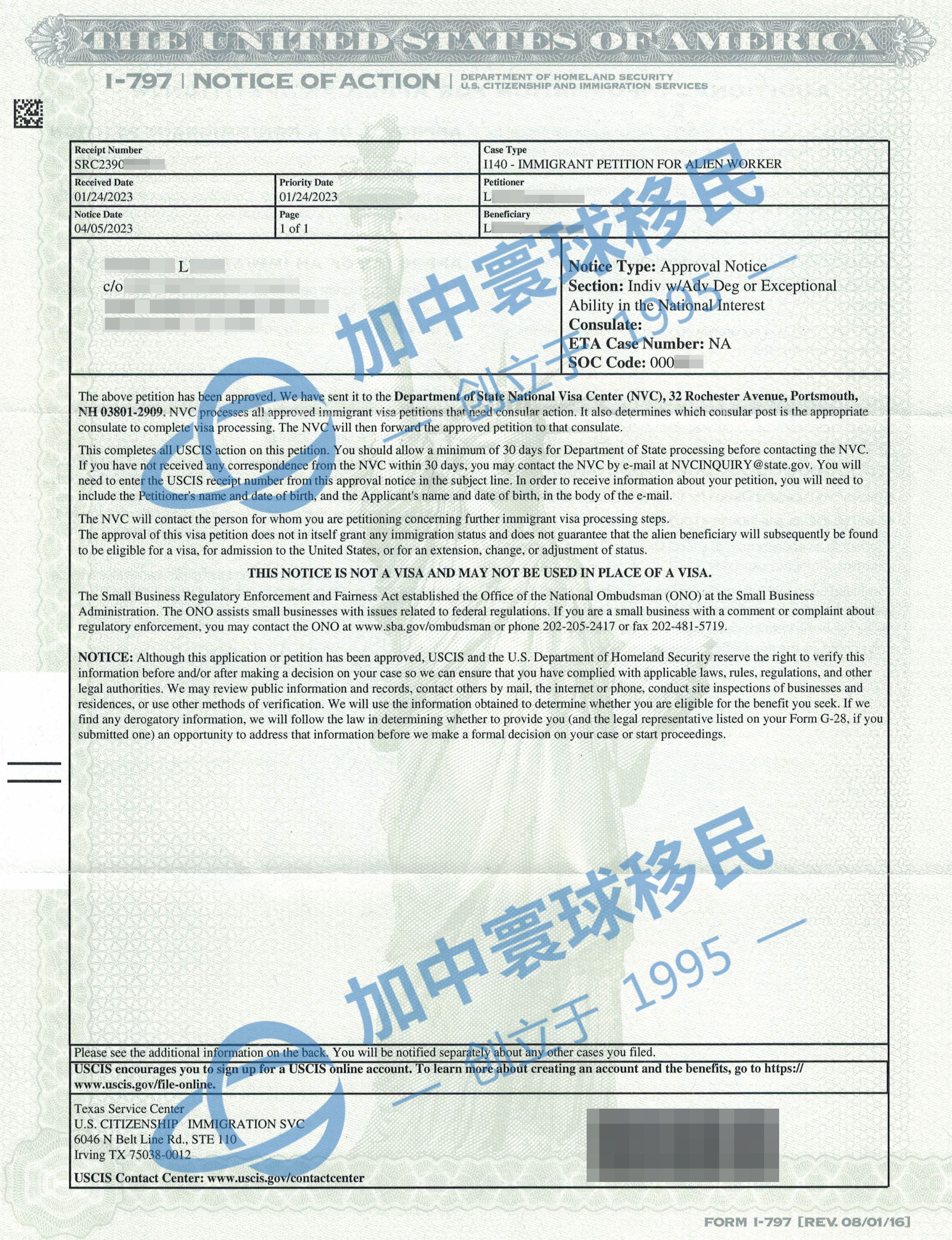 L先生是85后,在國內一家軟件科技公司擔任高管。英語水平良好,經加中寰球評估,L先生滿足獎項、協會成員、發表論文及專著、媒體哦報道方面申請材料,美國移民局在收到材料建檔之后兩個月順利獲批 申請流程: 2023年1月20日,遞交申請材料 2023年2月6日,建檔 2023年4月13日,I-140獲批