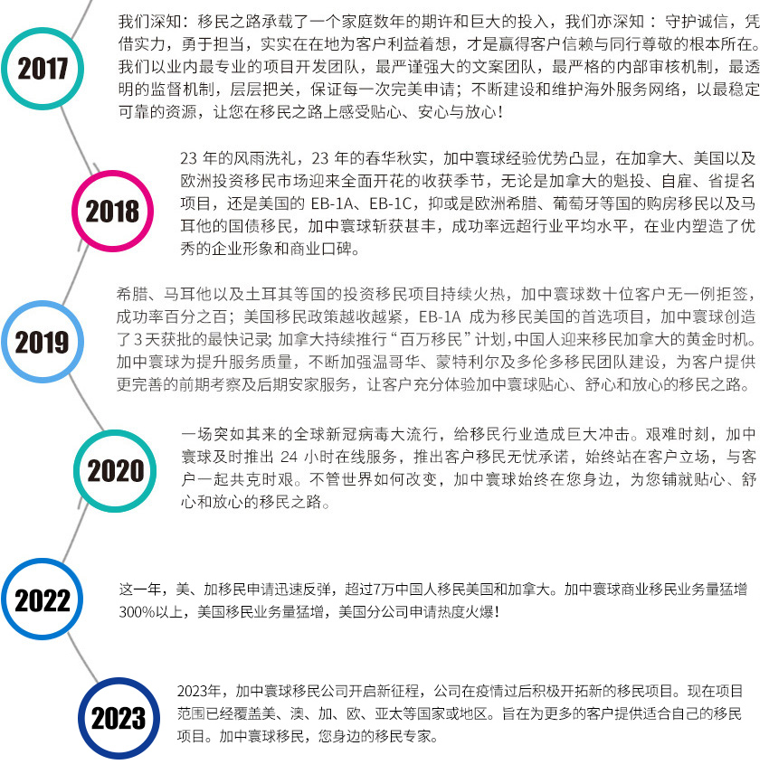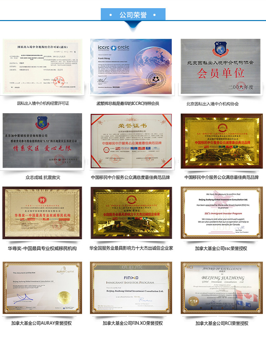 北京加中寰球投資咨詢有限公司專注投資移民服務29年,是國內首批經公安部批準的因私出入境中介機構,也是北京因私出入境中介協會創建單位之一。曾被搜狐、新浪等國內多家權威媒體授予“最具影響力移民品牌”、“最具專業權威移民機構”、“中國行業十大影響力品牌”、“中國移民服務典范品牌”。
