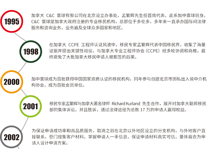1998年9月針對加拿大專業工程師協會(CCPE)不承認中國大陸工程師資格(原因是不滿足從小學到中學12年全日制教育時間),導致大批工程師背景的申請人在申請過程中將面臨被拒簽的結果這一事件,以移民專家孟繁輝為領袖的加中寰球移民,在充分參透事件本質的基礎上,提出了一套有效解決此問題的動議,并搜集自1977年恢復高考制度—1998年期間所有有關的高考試題及大量的一手證據,證明此階段中國大陸的高中畢業生雖然沒有滿足12年全日制教育時間,但是高考成績完全符合加拿大大學錄取標準。通過加中寰球與CCPE的多輪商榷,1999年2月,CCPE終于認可此階段的中國申請人的入學資格和相關大學學歷。